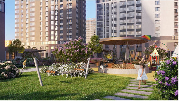 Закрытая территория двора - единое пространство для игр, прогулок и отдыха. В проекте предусмотрены площадки для игр детей дошкольного и младшего школьного возраста, площадки для отдыха взрослого населения и площадки для занятий спортом.
