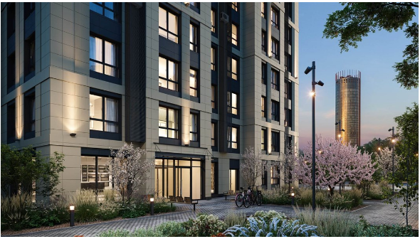 Ландшафт продолжает идею здания ‒ современное и функциональное пространство с дизайнерским озеленением и освещением. Для взрослых во дворе расположена лаунж зона, а для детей ‒ спортивная и детская площадка.